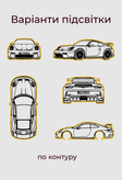 можлива по контуру (для всіх ракурсів), передні фари (передній та обʼємний), задні фари (задній), колеса (боковий)
